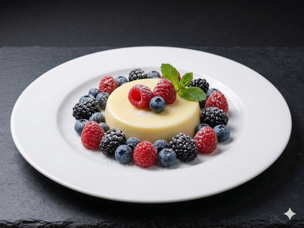 Ein seidiges, gestocktes Rahmdessert mit frischem Zitronengeschmack, verfeinert mit Olivenöl und Flockensalz, garniert mit frischen Beeren